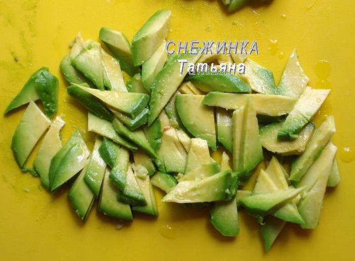 Авокадо нарезаем небольшими ломтиками. Немного солим и сбрызгиваем соком лимона.