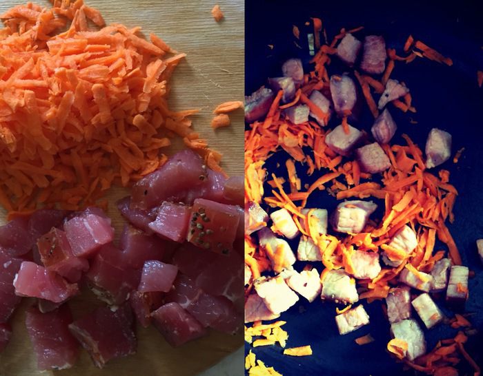 Затем нарезать вяленую свинину и натереть морковь. И также обжарить, где-то минут 5. Добавить в кастрюлю.