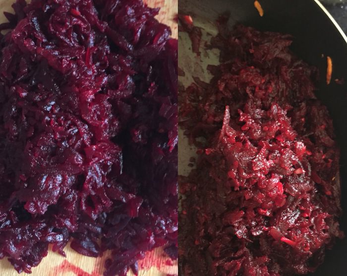 Натереть свеклу. И перед тем как начать ее обжаривать в сковороду добавить томатную пасту и 2 измельченных зубчика чеснока, и затем только все вместе прожарить 5 минут.