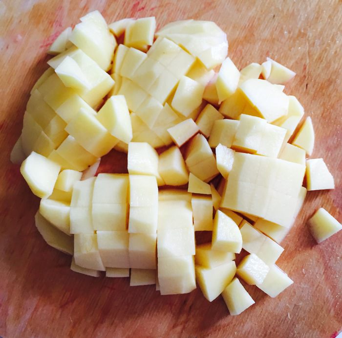 Порезать картошку кубиками и вместе с обжаренной свеклой добавить в кастрюлю.