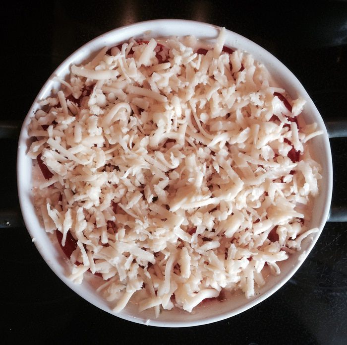 Присыпаем тертым сыром и ставим выпекаться в заранее разогретую до 200°С духовку на 30 минут.