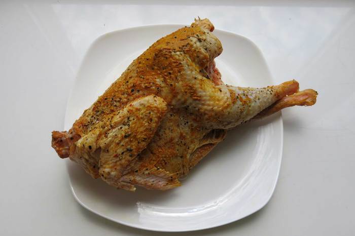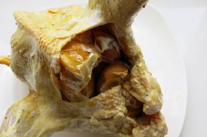 Смешиваем специи и сметану, обмазываем цыпленка.