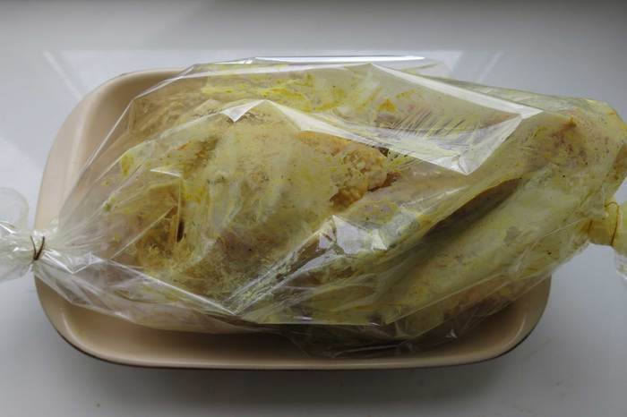 Кладем птицу в рукав, нагреваем духовку до 220°C.