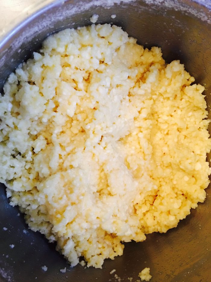 Получившийся творог перекладываем в кастрюлю с толстым дном или с антипригарным покрытием, туда же добавляем оставшиеся ингредиенты и тщательно перемешиваем руками.