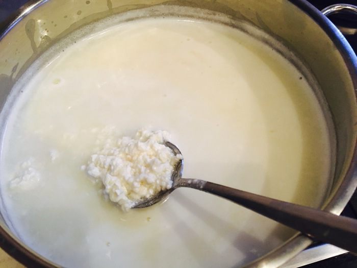 Заливаем молоко в кастрюлю, добавляем к нему творог и помешивая доводим до кипения. Как смесь закипит варим на среднем огне еще минут 10, не забывая помешивать.