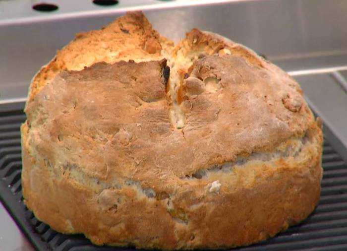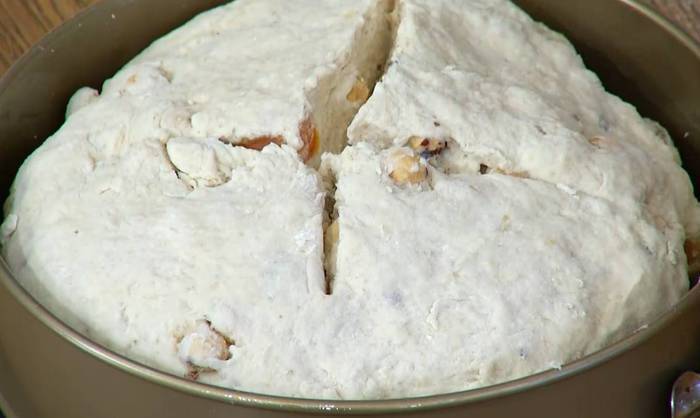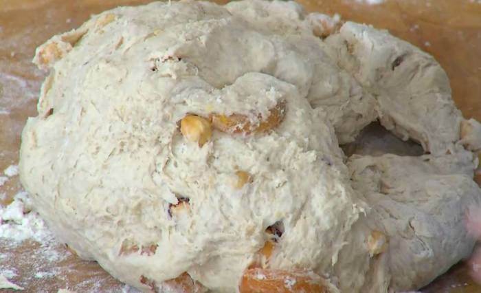 Приготовить тесто: соединить пшеничную и ячменную муку, отруби, фундук, курагу, смесь «дрожжевое тесто», соль, влить 2 ст. ложки оливкового масла и мед, все перемешать, затем небольшими порциями вливать 600 мл теплой воды, каждый раз вымешивая тесто. Вымесить тесто руками.