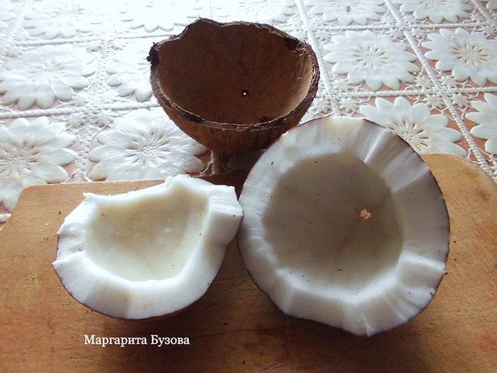 Прежде всего нужно открыть кокос (я бы посоветовала доверить это дело мужчине!). Для этого нужно проделать отверстие в одном из трех "глазков" и слить оттуда воду, если она там окажется. Я советую покупать кокос с водой, тогда он будет более сочный. Чтобы выбрать именно такой кокос, нужно его взять в руки, немного потрясти, и Вы услышите воду. К тому же сочный кокос более тяжелый по сравнению с теми, внутри которых нет воды.