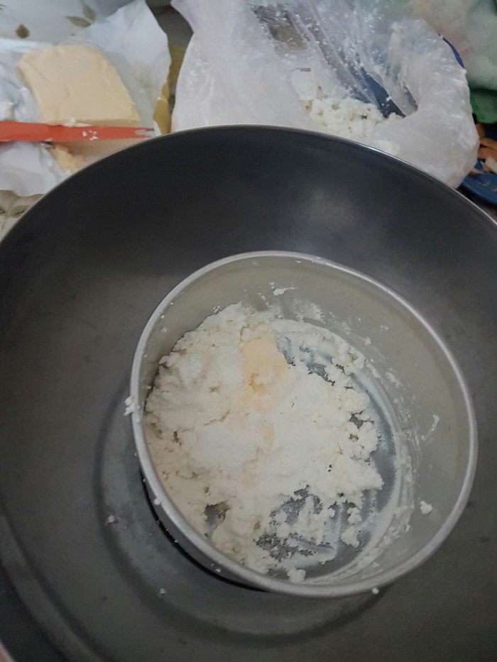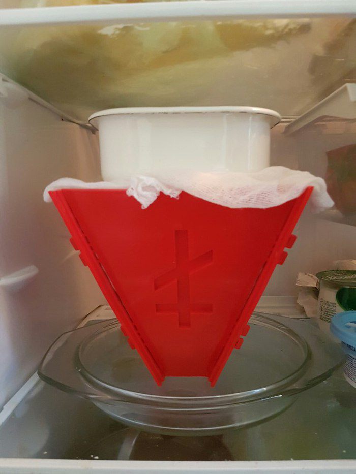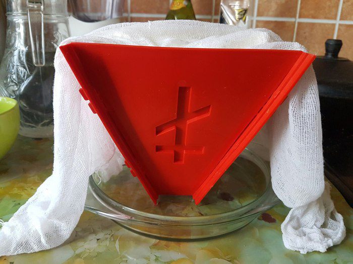 Подготовить пасочницу — для этого нужно положить в нее влажную марлю, прижать к стенкам. Выложить в нее всю нашу массу и утрамбовать ее. Свисающими краями марли накрыть массу, сверху положить миску с водой или любой другой гнет... что-то тяжелое! Саму форму с пасхой тоже ставим в глубокую миску, т.к. в процессе стояния с нее будет стекать жидкость, которую нужно периодически сливать.