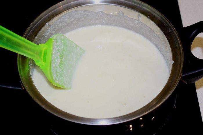 Поставить на маленький огонь и готовить, постоянно помешивая, до первых пузырей (т.е. до закипания), сначала масса станет жидкой, это нормально, затем она немного загустеет.