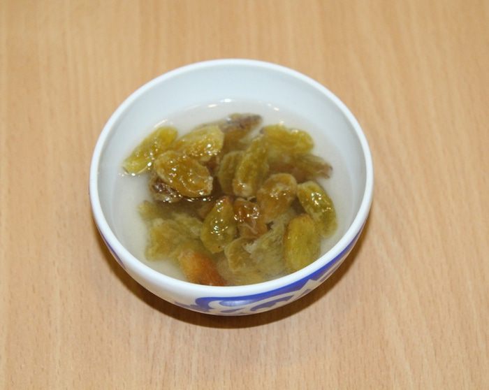 Изюм помыть, залить кипятком и оставить на 20 минут.