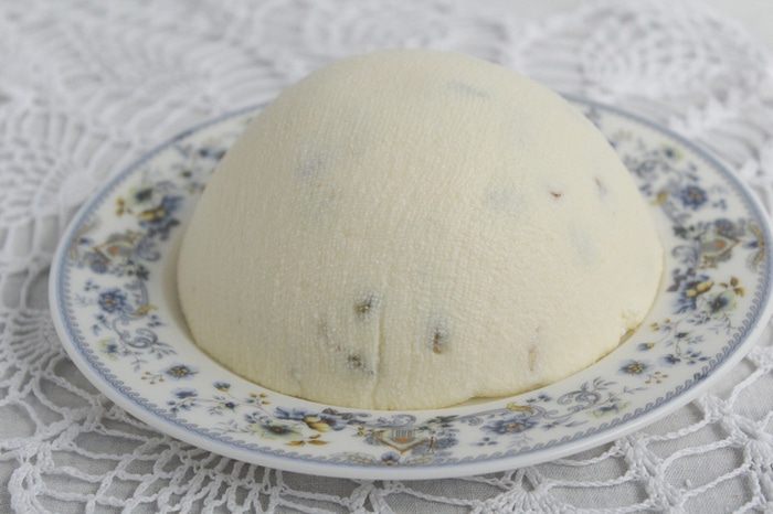 Готовую пасху аккуратно освободить из формы, развернуть марлю и поставить на блюдо.