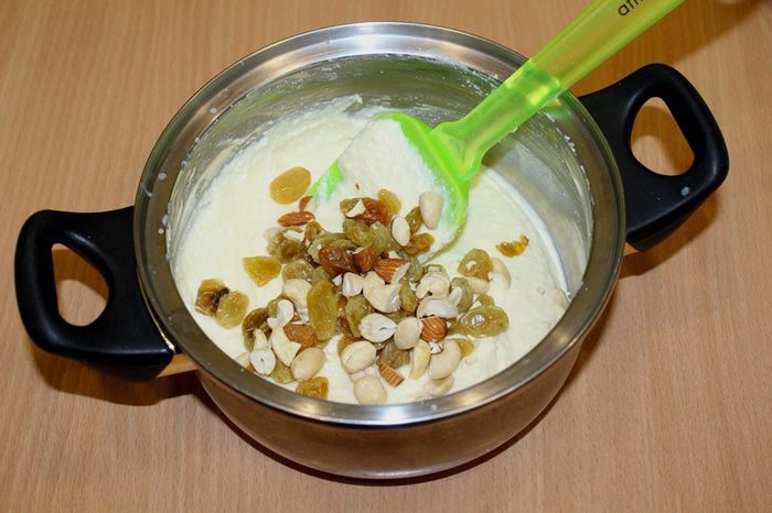 Затем добавить изюм, орехи и хорошо перемешать.