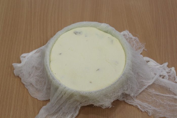 Пасочницу или подходящую посудину застелить смоченной в воде и сложенной в 2 слоя марлей.