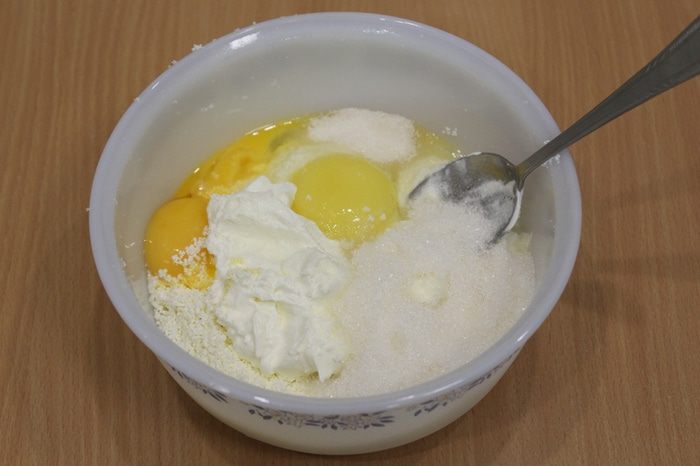 Добавить яйца, сахар, сметану, ванильный сахар и все хорошо перемешать.