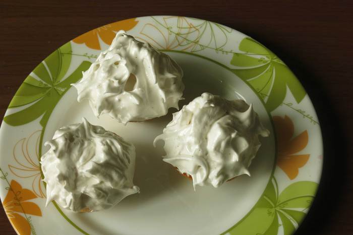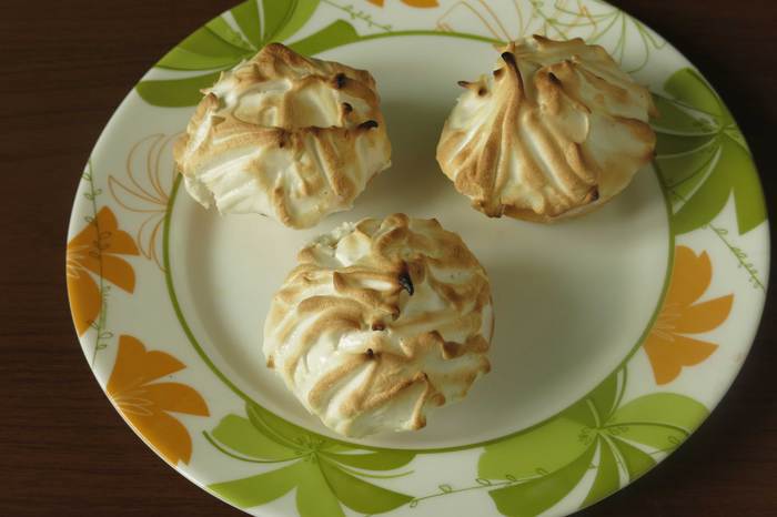 Запекаем на гриле. Пригодилась функция духовки гриль с конвекцией. Пробовал запекать при 250°C гриль с конвекцией — готово все за 50-60 с, очень быстро запекается, можно упустить момент, когда надо доставать тарталетки. По некоторым интернет источникам температура 600 Ф, выше 250°C поднимать температуру не стала, объект запекания слишком мал. При 230°C 2 минуты, 2 минуты 10 секунд, чем дольше прогрета духовка, тем быстрее покрывалось корочкой безе. С открытым огнем рекомендуют запекать три минуты под закрытой крышкой гриля. Такой способ не опробовала.