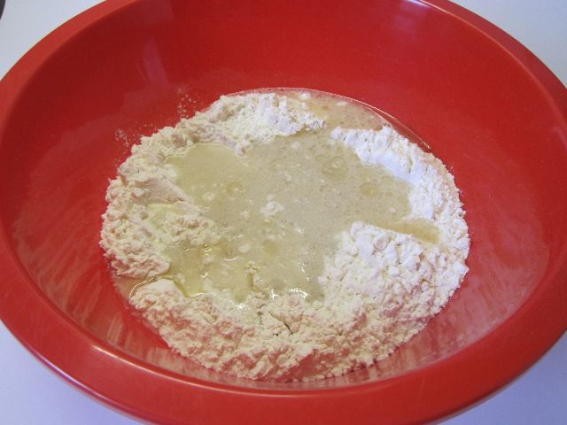 В просеянную муку всыпать сахар, соль и сухие дрожжи.