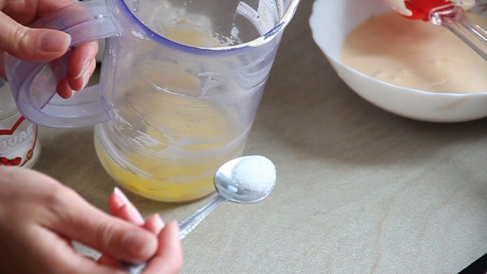 Отделяем желтки от белков. 4 желтка у нас остается в отдельной миске. 2 белка мы ставим в холодильник – они нам понадобятся для приготовлении глазури. А оставшиеся 2 белка оставляем в тарелке на столе для приготовления теста.