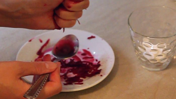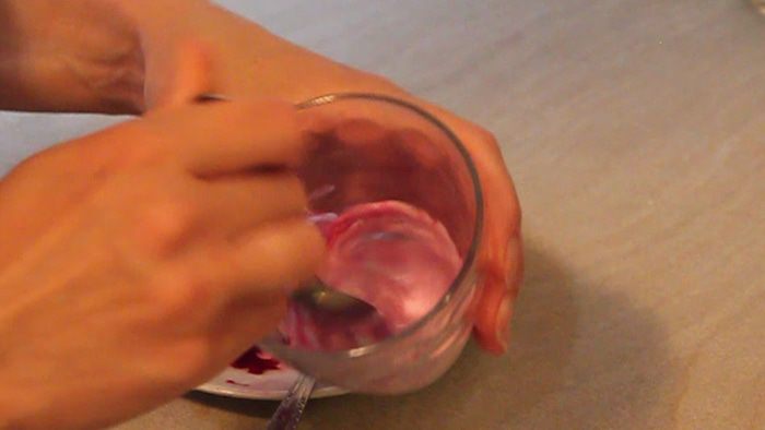 Сок свеклы добавляем в отдельный стаканчик с отложенной 1 столовой ложкой глазури и получаем желаемую окраску.