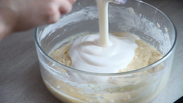 Начинаем постепенно добавлять взбитые белки и еще один стакан муки. И так же все перемешиваем.