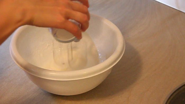 Начинаем взбивать 2 белка на маленьких оборотах блендера или миксера, постепенно добавляя сахарную пудру. В итоге получаем очень устойчивую пену.