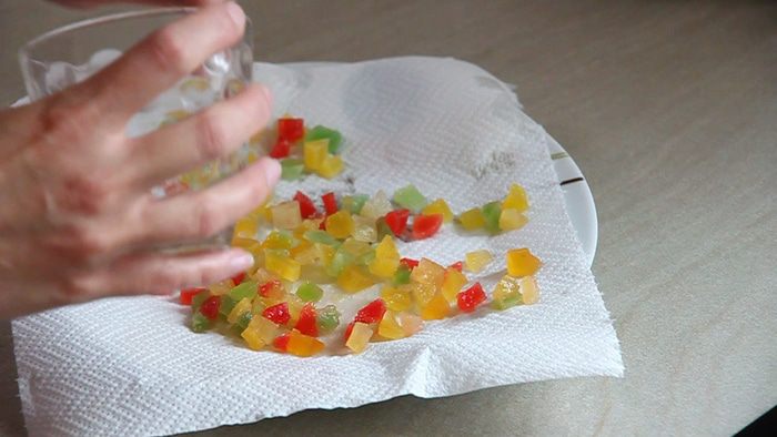 Тем временем, с цукатов сливаем воду и выкладываем на бумажное полотенце немного подсохнуть.