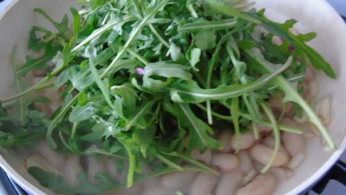 Всыпаем большой пучок руколы и вливаем херес (можете заменить белым вином) и, все время помешивая, держим на огне пока рукола привянет :) Солим и перчим по вкусу.