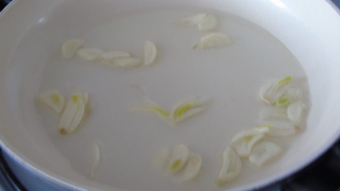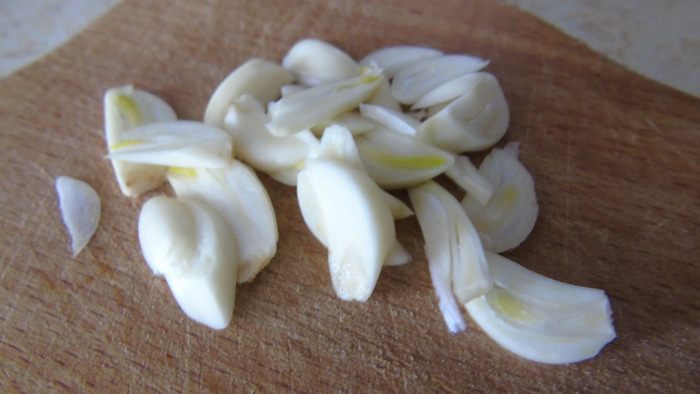 Чеснок нарезаем слайсами.