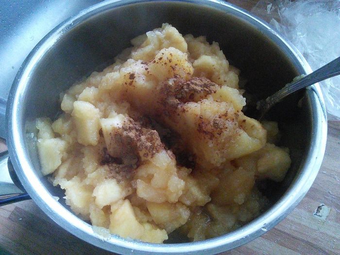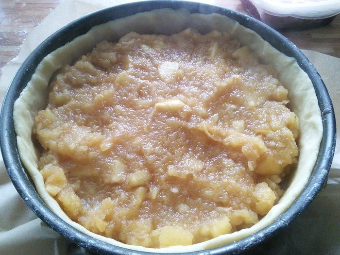 Распределить начинку. У меня яблоки хорошо разварились, но остались и кусочки.
