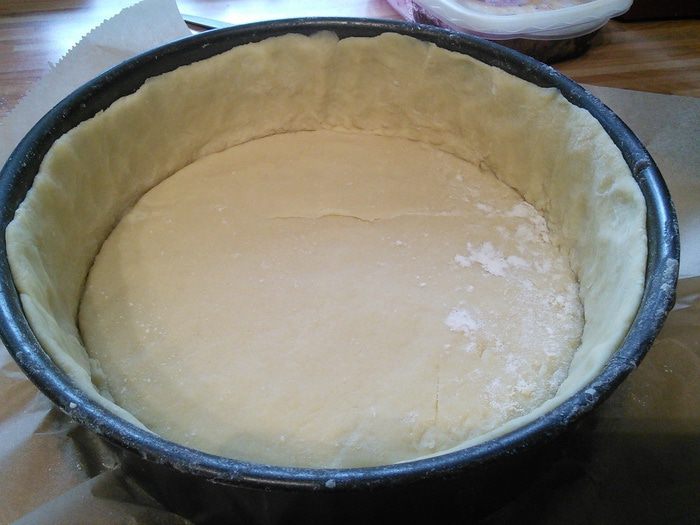 Выложить донышко, из остатков теста сформировать бортики, выложить ими форму и хорошенько прижать.