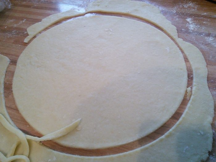 Приблизительно 1/4 часть теста отставить в сторону (это будет "крышка" пирога). На посыпанной мукой поверхности раскатать тесто, выдавить донышком от разъемной формы (26 см в диаметре) круг. Саму форму выложить пергаментом.