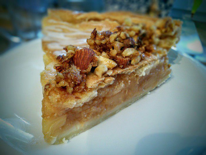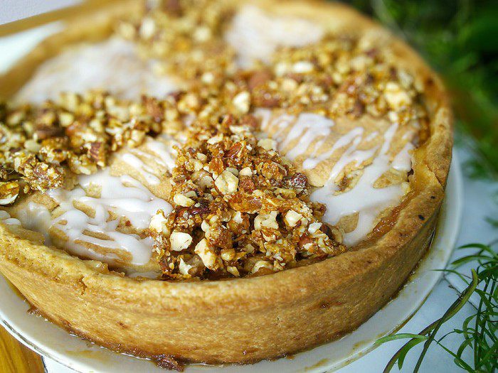 Для декора делаем помадку из лимонного сока и сахарной пудры, мысленно разделить поверхность пирога на 8 сегментов. Для кроканта расплавить сахар, раздробить орехи и смешать их с карамелью. Выложить сегменты помадкой и крокантом.