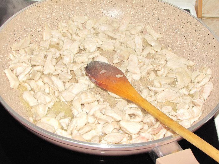 Куриное филе нарезать кусочками. Разогреть в сковороде 2 ст. л. оливкового масла обжаривать 2-3 минуты, пока мясо не побелеет.