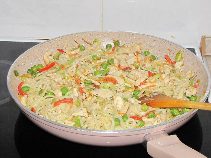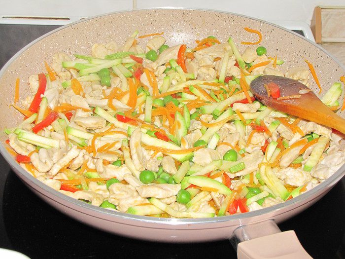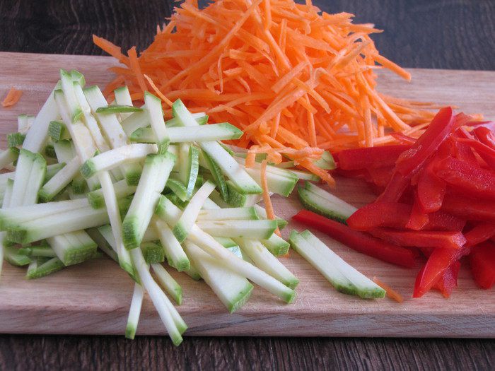 Пока варятся спагетти, нарезать овощи. Сладкий перец и кабачек тонкой соломкой, морковь натереть на корейской терке.