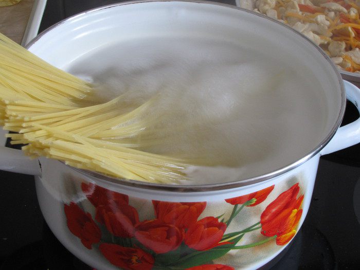 Первым делом поставить на огонь кастрюлю с водой. Когда вода закипит засыпать спагетти и варить до состояния альденте.
