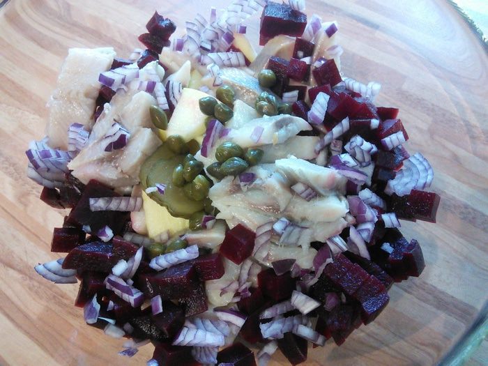 Селедку (у меня филе) порезать на кусочки, лук и свеклу мелким кубиком, каперсы можно оставить целиком, а можно так же мелко порубить. Яблоко очистить и нарезать небольшими ломтиками.