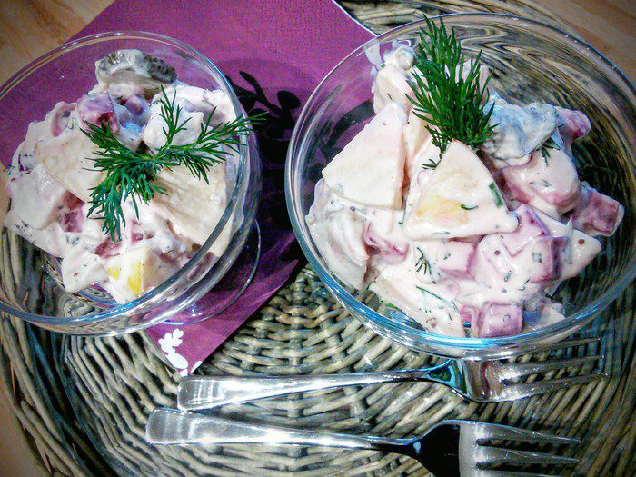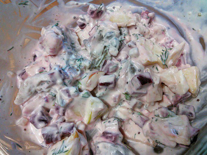 Все ингредиенты соединить с соусом, заправить перцем, при необходимости посолить. Добавить рубленный укроп.