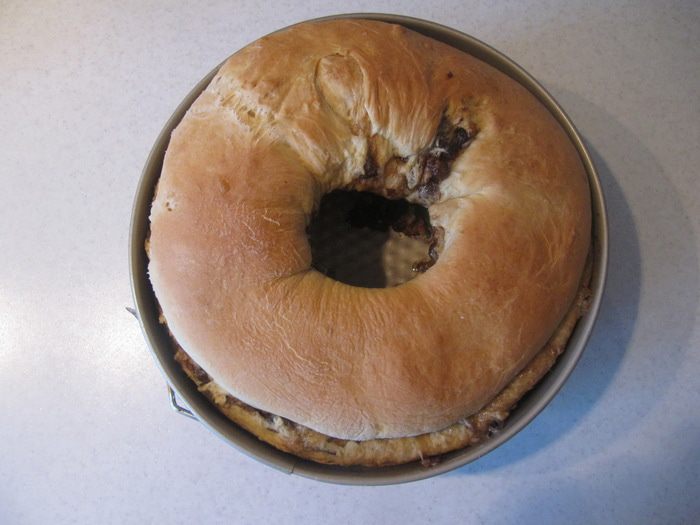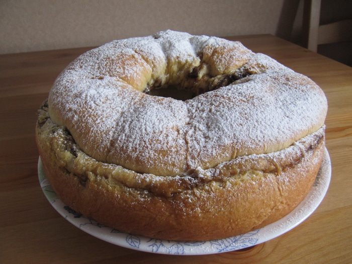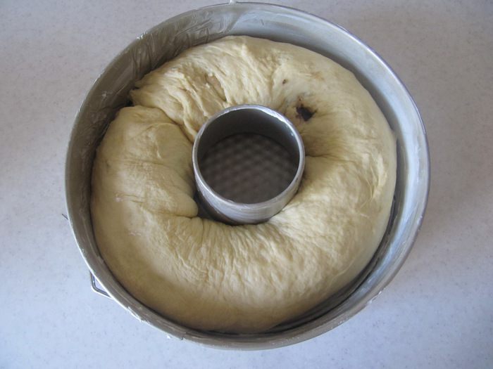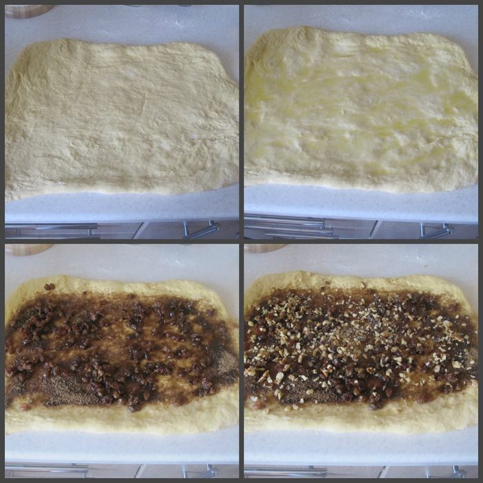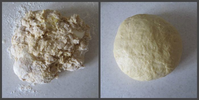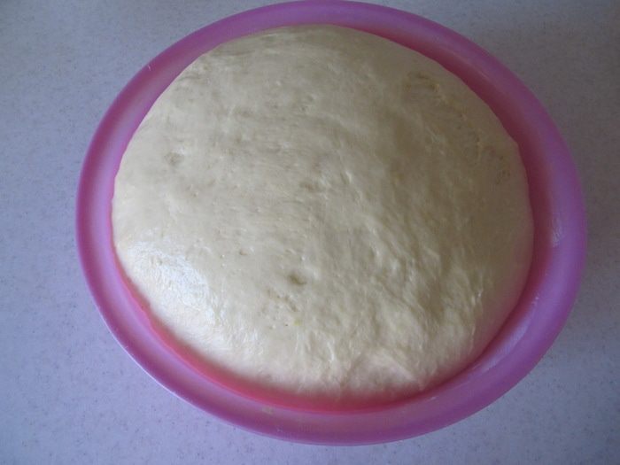 Добавить просеянную муку и соль. Замесить тесто с помощью ложки. Затем добавить размягченное сливочное масло и яйцо и вымесить тесто руками до гладкого эластичного состояния (около 7-10 мин.). Поместить тесто в емкость, смазанную тонким слоем сливочного масла, накрыть пленкой и отправить в теплое место на 1 час.