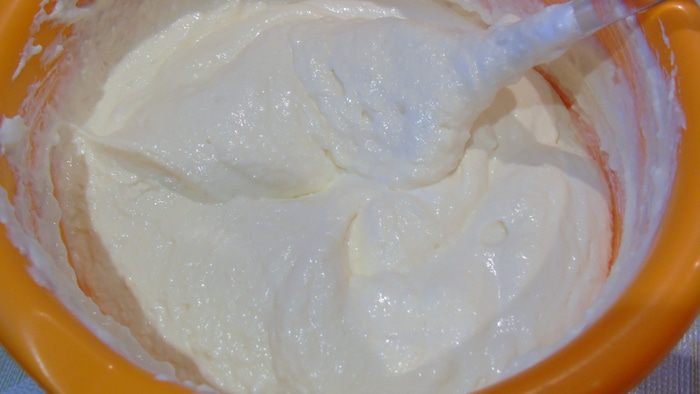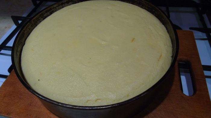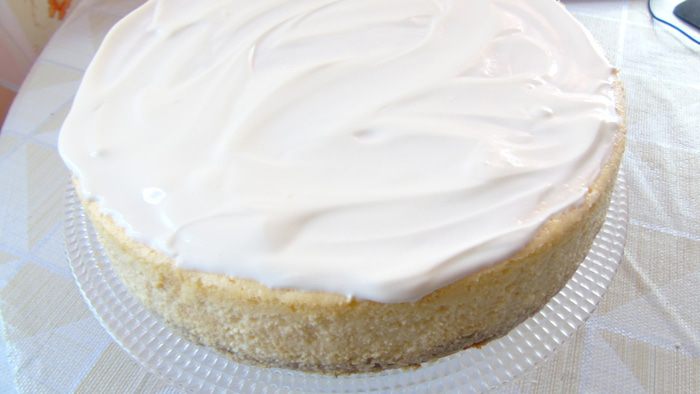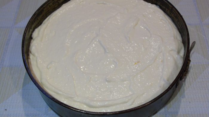 Несколькими приемами введите взбитые белки в творожную массу. Выложите начинку поверх коржа.