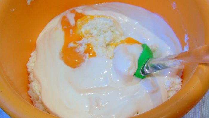 К творогу добавьте сметану и желтки, разотрите ложкой.