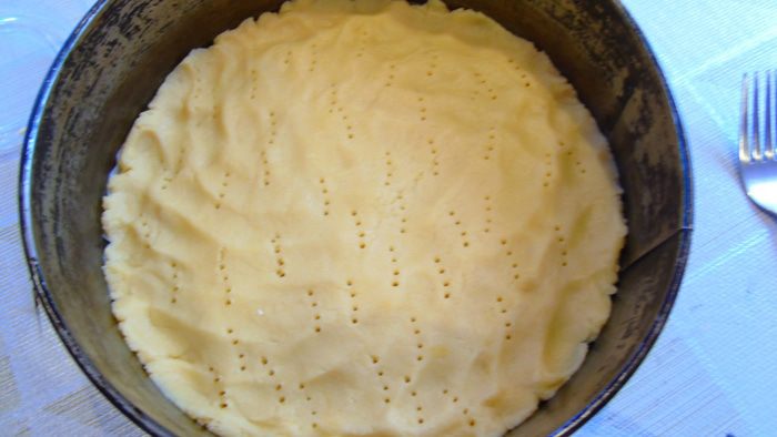 Выложите тесто в форму и разровняйте руками по дну. Наколите вилкой и отправьте выпекаться на 20-25 минут, до золотистого цвета. Остудите минут 15, не вынимая с формы.
