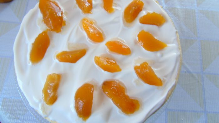 И сверху — любыми фруктами или ягодами. Я использовала консервированные персики.