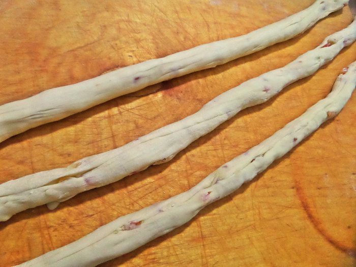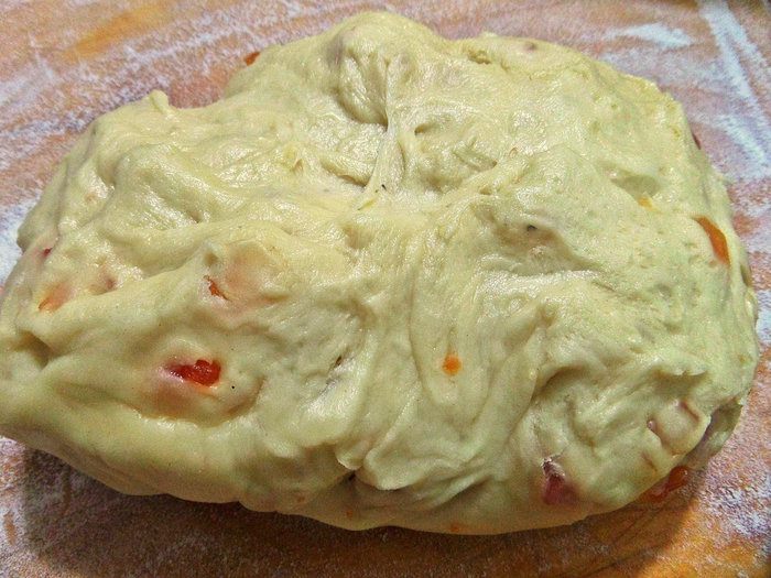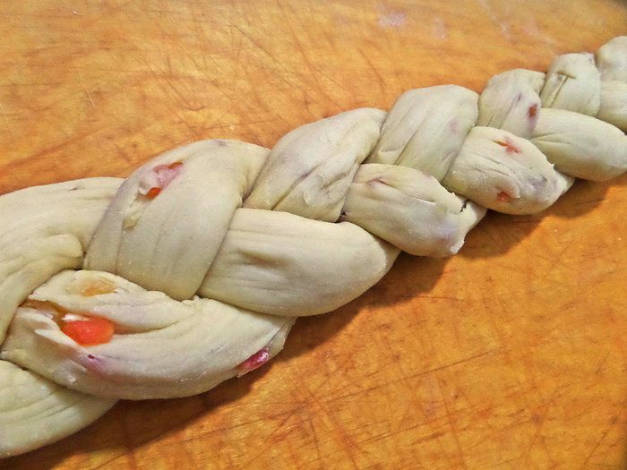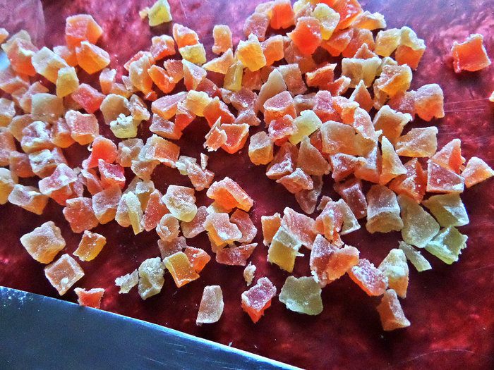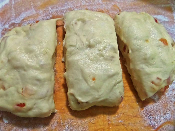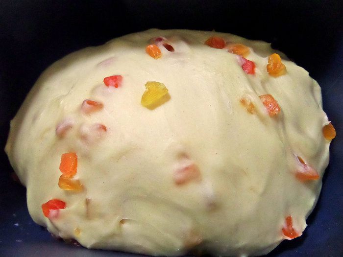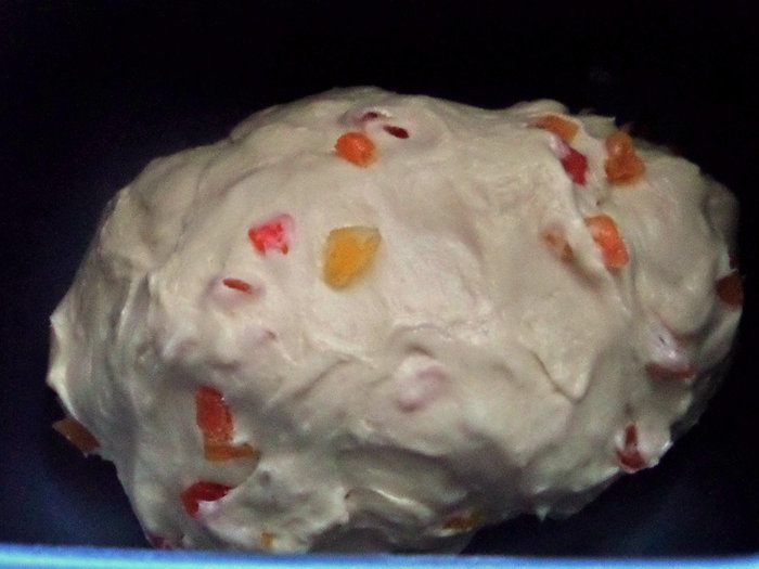 Высыпать цукаты во время замеса теста, когда вся мука впитается в ком.