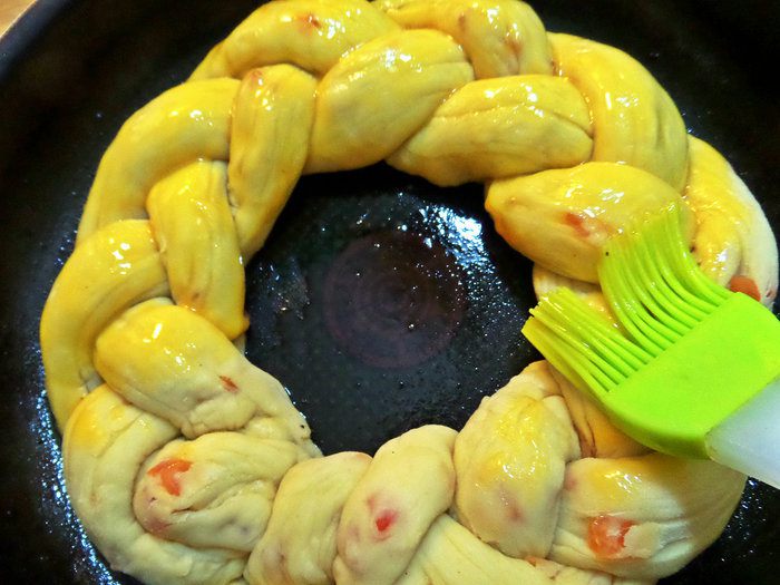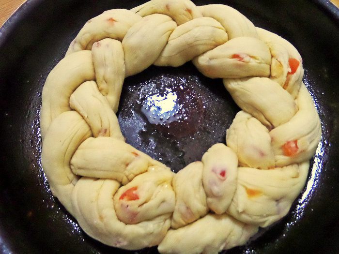 Перенести косу в смазанную форму (форма 26 см в диаметре) и дать постоять минут 20.