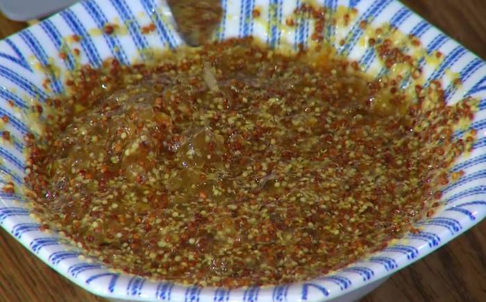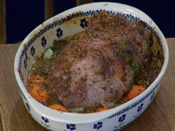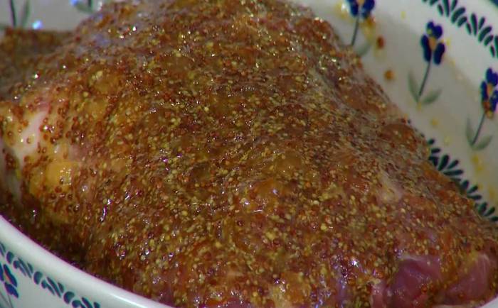 Свинину выложить в жаропрочную керамическую форму и смазать со всех сторон джемом с горчицей.