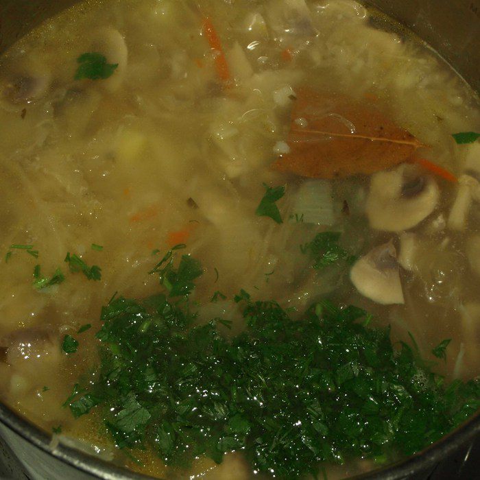 Отправляем в густой картофельный отвар тушенную капусту с грибами, добавляем остатки зелени, лавровый лист. Соль, перец по вкусу и оставляем томиться на медленном огне 10-15 минут.