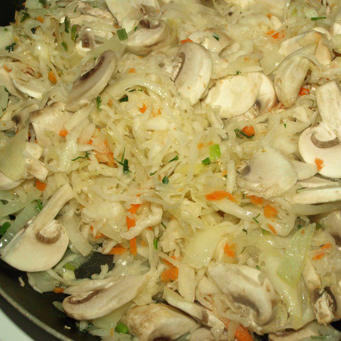 Добавляем к овощам отжатую от рассола квашеную капусту, нашинкованные пластинами грибы, закрываем крышкой и тушим на тихом огне. Пока капуста не станет мягкой.