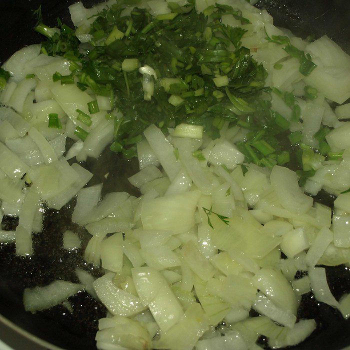 Лук чистим, режем. Половину петрушки и укропа мелко рубим. В сковороде разогреваем растительное масло. Отправляем в сковороду лук и зелень. Пассеруем, пока овощи не станут золотистого цвета.