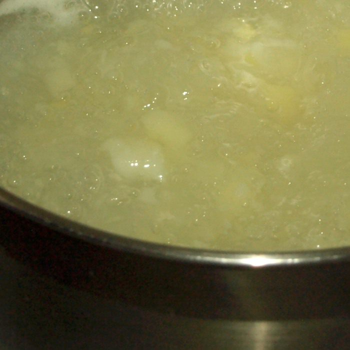 1,2 л наливаем в кастрюлю, доводим до кипения и закладываем нарезанный кубиками картофель. Варим до готовности. Когда картофель сварится, то половину разминаем.