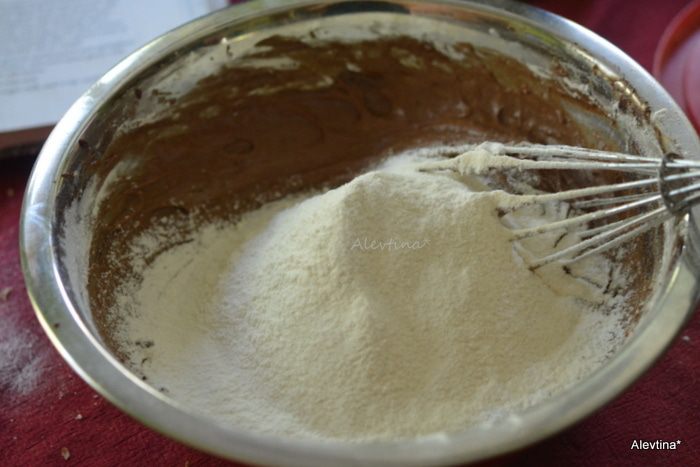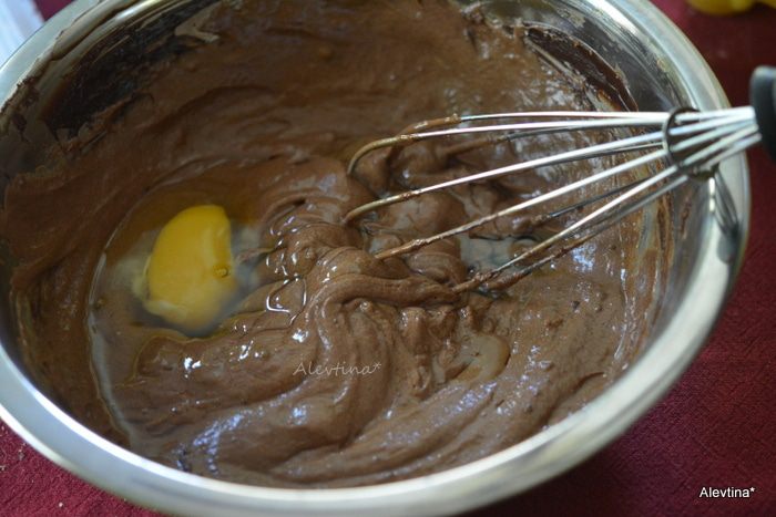 Добавить греческий йогурт или сметану, перемешать. Влить горячую воду, ванильный экстракт и медленно перемешать. Тесто добавить в приготовленную форму. Распределить аккуратно.