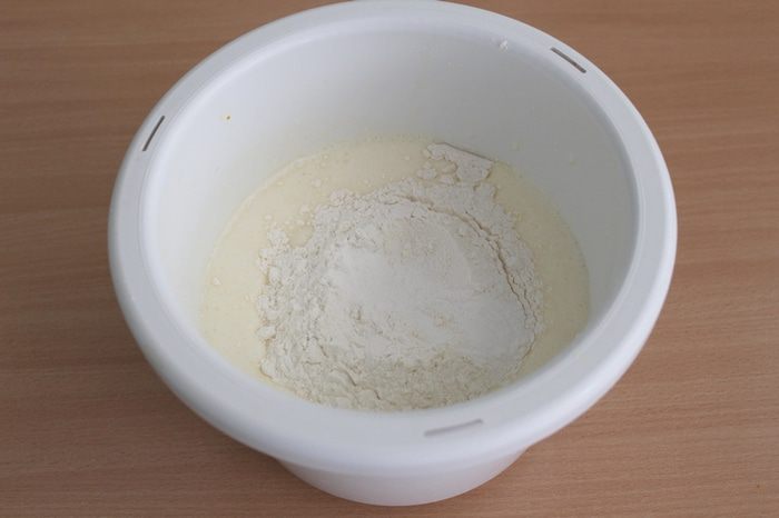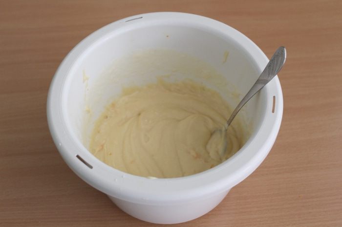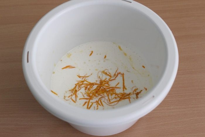 Взбить яйца с сахаром до пышной пены. С апельсина снять цедру и выжать сок 50 мл. Добавить растопленное масло.